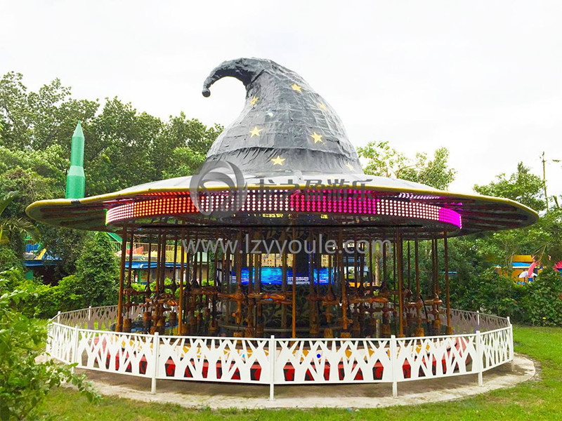 “飛天魔帽”旋轉木馬也是由許昌龍之盈游樂設備有限公司研發制作,該產品結合著名電影《哈利·波特》元素,設備整體是一個巨型的巫師帽,搭配中央顯示屏,結合精心華麗的天幕與地景,以及奇幻的煙霧、泡泡等特效,提供白天到黑夜的神奇魔法飛行體驗。