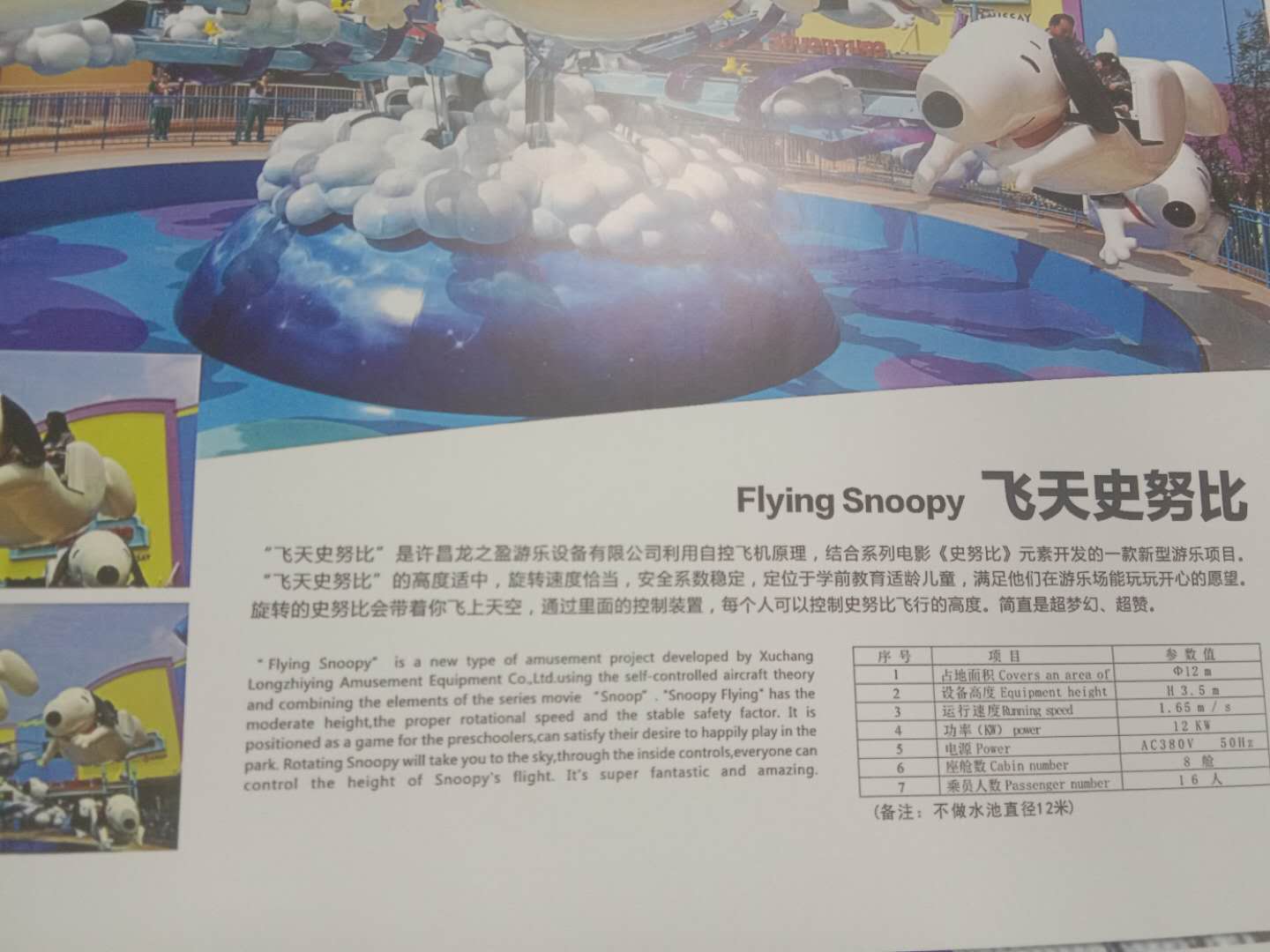 如上圖,這款新型飛天史努比是一款屬于自控式的飛機(jī),圖冊中的飛天史努比是龍之盈已經(jīng)銷售出去并且正在運(yùn)營中的游樂設(shè)備,上面還有大人和小孩在坐,可見喜歡飛天史努比的粉絲不單單都是小朋友啊,這一個頁面做圖冊的設(shè)計師也設(shè)計的很好看,跟實(shí)物結(jié)合在一起,簡直是美極了,下面我來介紹一下飛天史努比的特點(diǎn)。