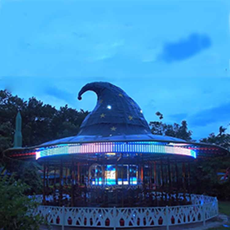 旋轉木馬是游樂場里常見的一款兒童游樂設備,伸手大人與小孩的喜愛。由于技術的發展,傳統的旋轉木馬延伸出許多造型新奇的新型轉馬,今天就為大家介紹一款由龍之盈生產,大陸與臺灣攜手設計的一款新型轉馬-飛天魔帽,采用了許多前沿的技術,加入了許多新的玩法,接下來就隨著開啟一段奇妙之旅吧。